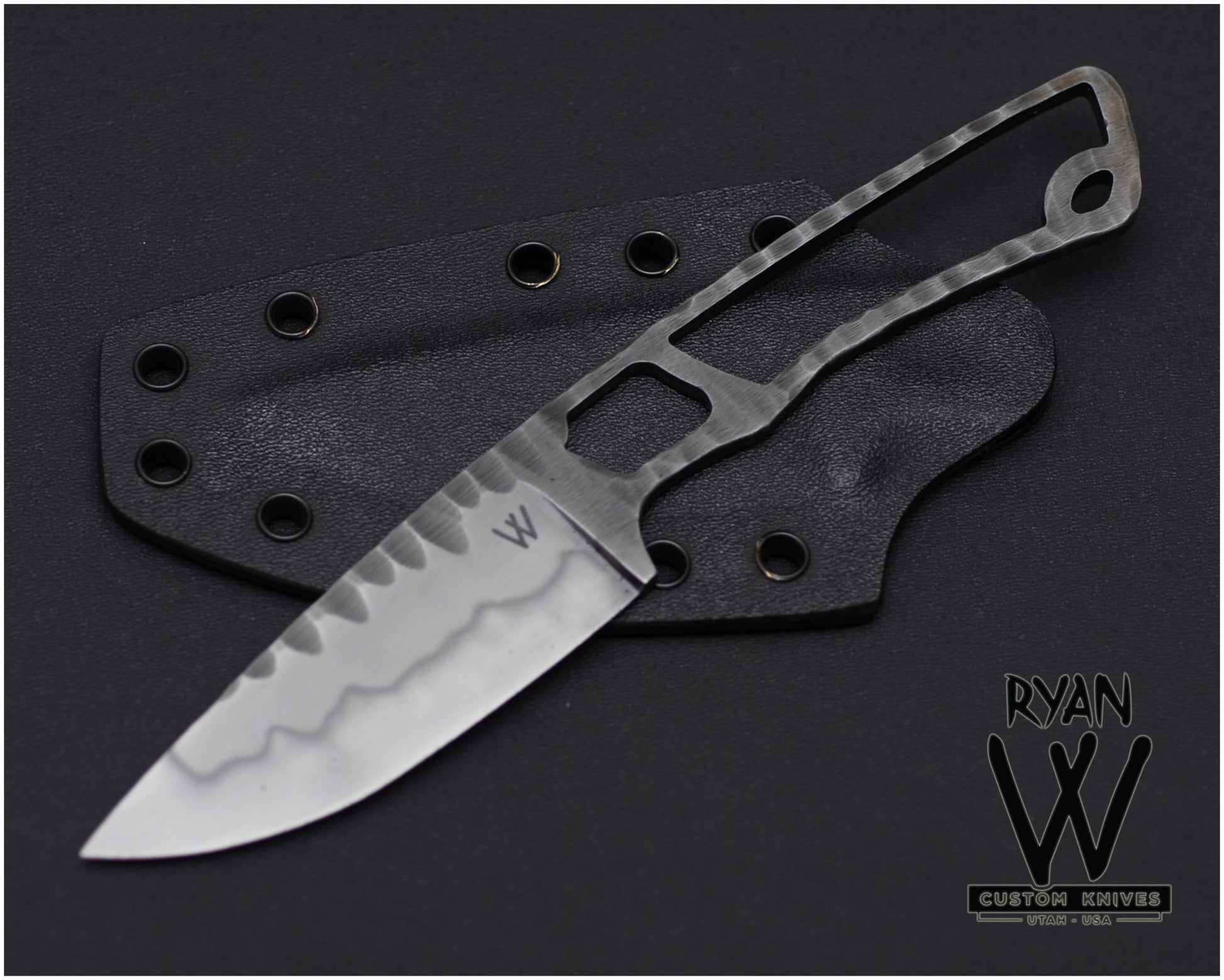 This is one of my "Knapped Trinity's" Steel is High Carbon W2 with a Differential Heat Treat (Hamon). OAL: 8" Blade: 3.5" It is perfect for throwing into your day pack, light weight and useful design.